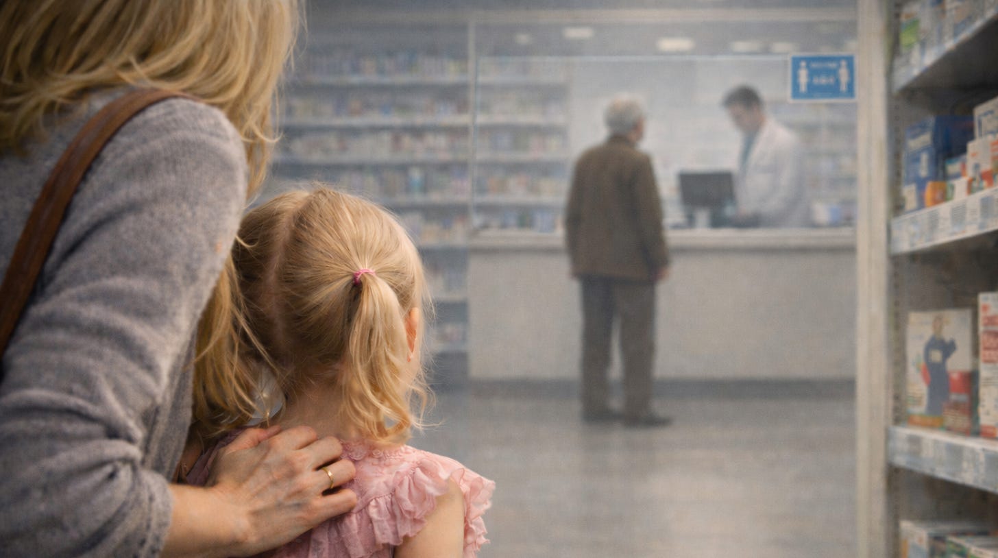 The pharmacy counter was cut off from the aisle by a waist-high barrier and a scratched sheet of plexiglass, a faded social distancing sticker still clinging to the corner. Behind it, the pharmacist never looked up: scan, tap, bag, staple.